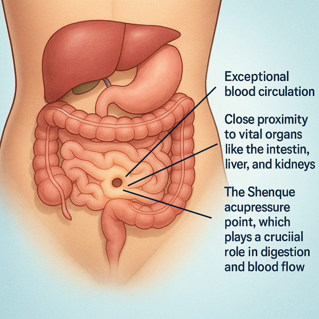 - The Shenque acupressure point, which plays a crucial role in digestion and blood flow