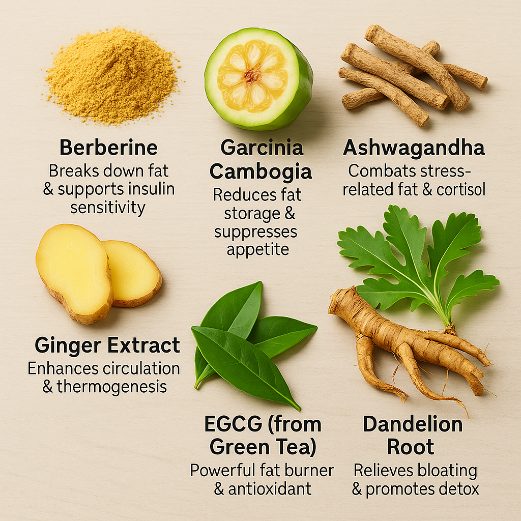 - Garcinia Cambogia: Reduces fat storage + suppresses appetite