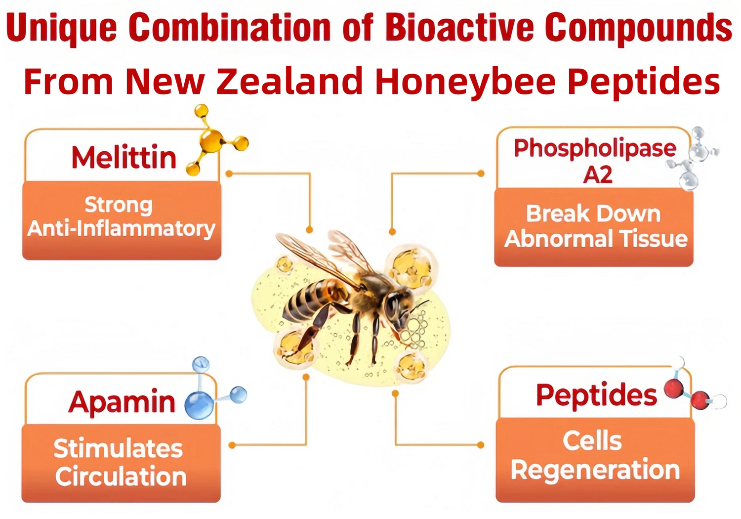 - New Zealand Honeybee Peptides: Modulate immune response, reduce inflammation, and promote skin cell renewal.
