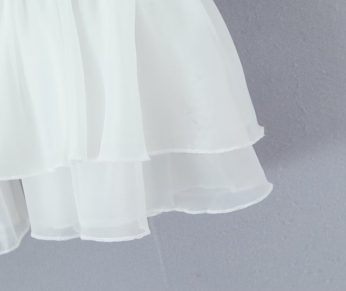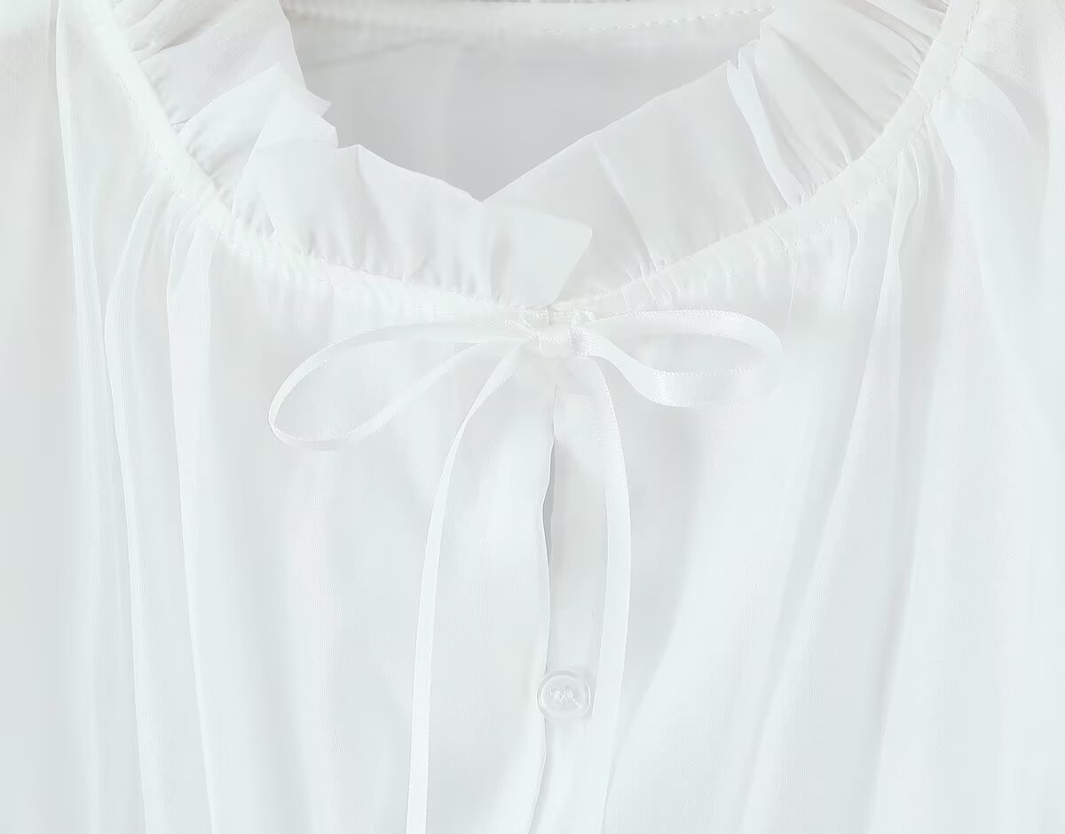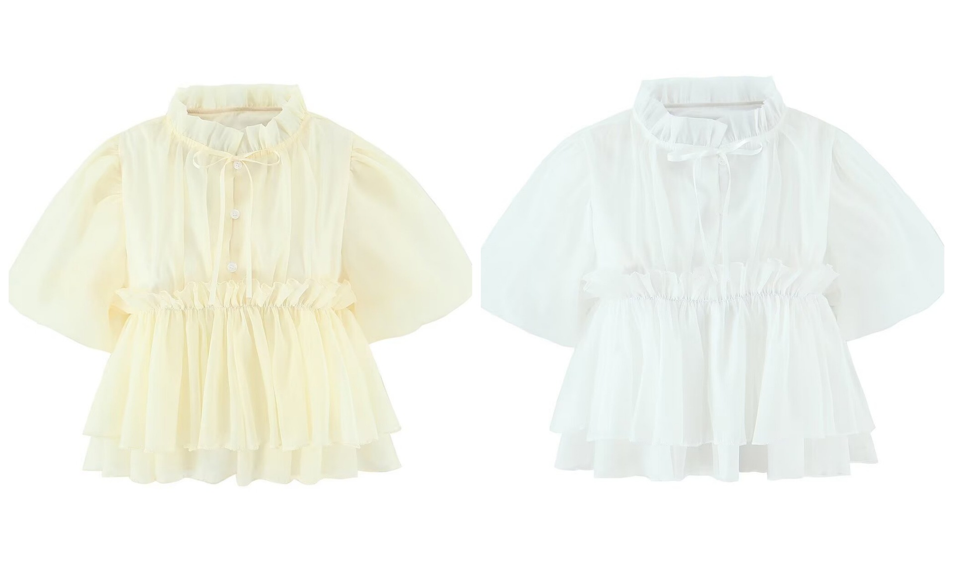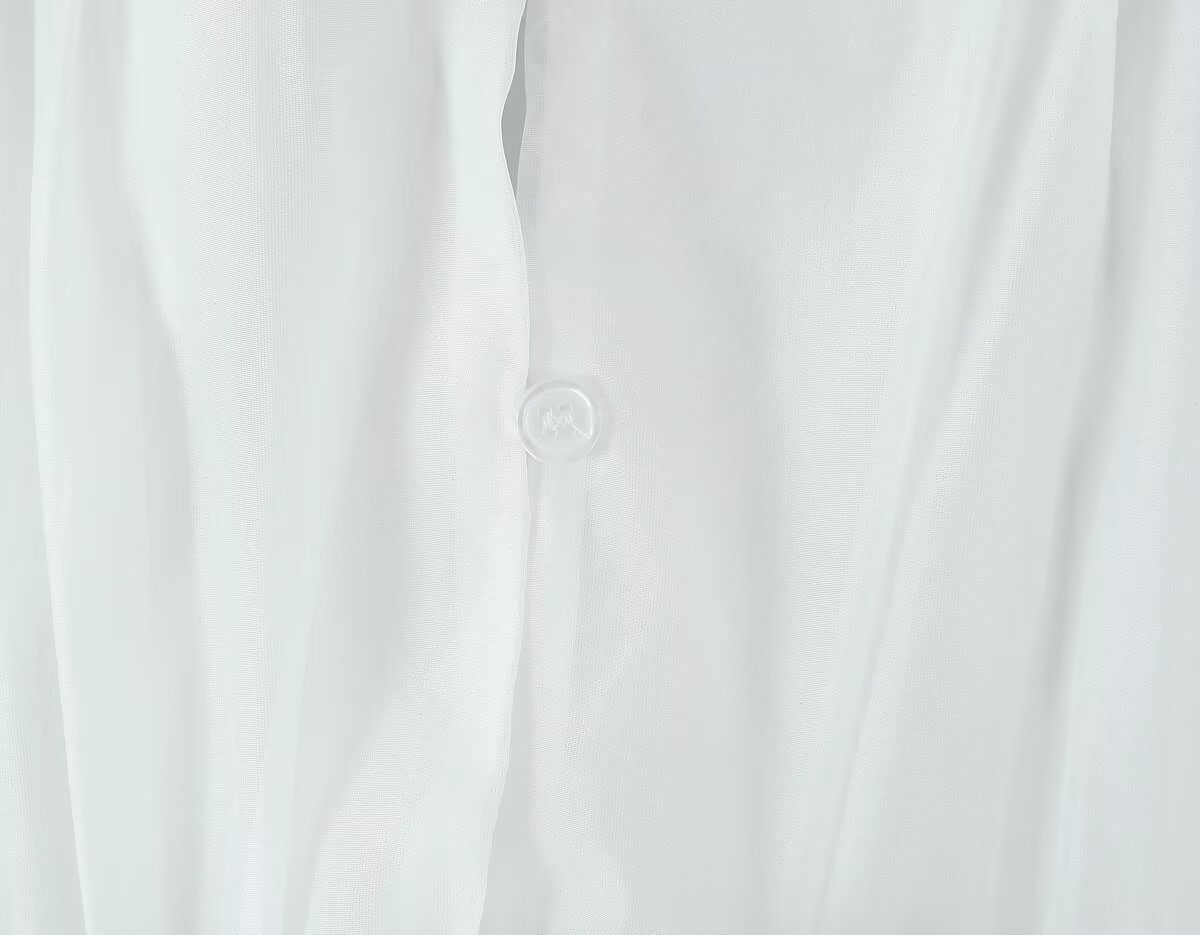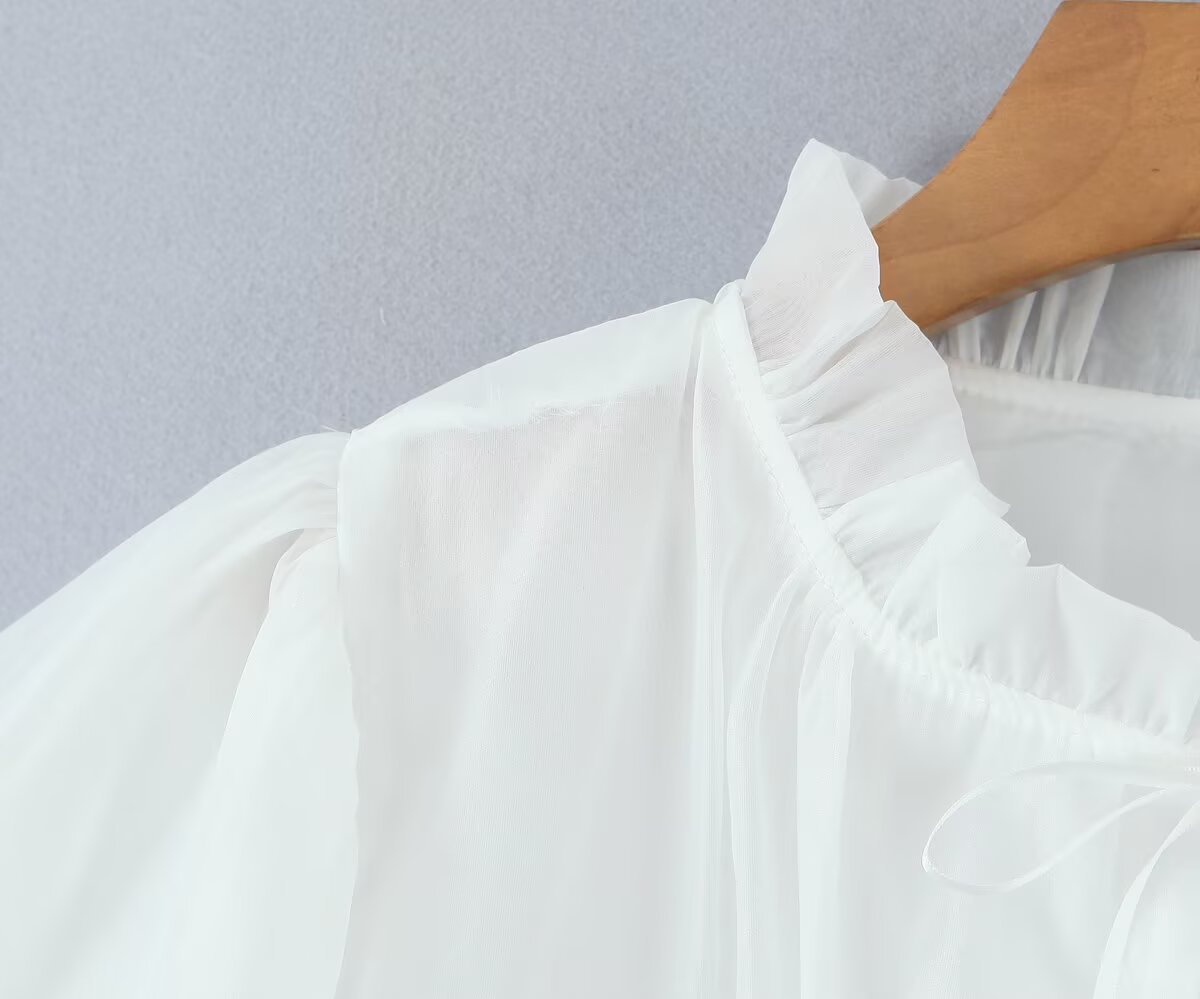 Stand up collar bubble sleeve waist cinching single breasted short sleeved shirt